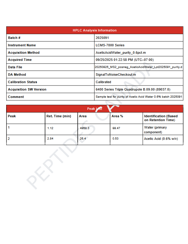 Acetic Acid 0.6% Solution is a sterile, non-pyrogenic aqueous formulation containing 0.6% (v/v) acetic acid in ultra-pure water, provided for controlled laboratory research use. It offers a mildly acidic environment for solubilisation, dilution, or vehicle media in experimental protocols where peptide or protein stability, pH control, and sterility are required.
