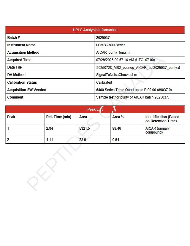 This batch of AICAR Peptide has been third party lab tested and verified for quality. Size: 5mg