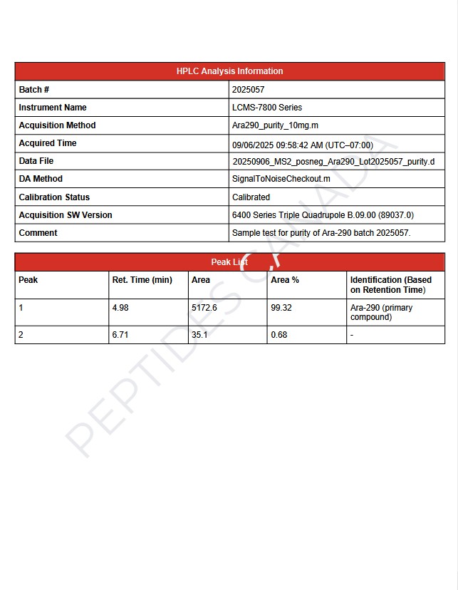 This batch of Ara-290 Peptide has been third party lab tested and verified for quality. Size: 10mg