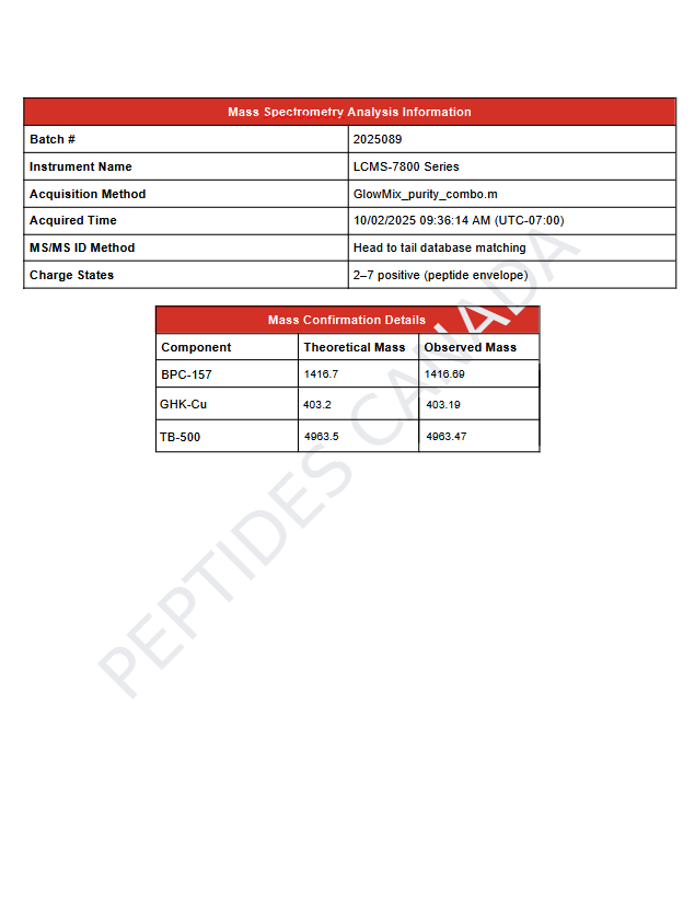 This product is a multi-peptide/nutrient fusion — BPC-157, GHK-Cu, and TB-500 — each with distinct chemical characteristics, modifications, and molecular weights. Because of the mixture’s complexity, a single definitive molecular formula is not listed. Analytical quality is confirmed for the mixture batch.