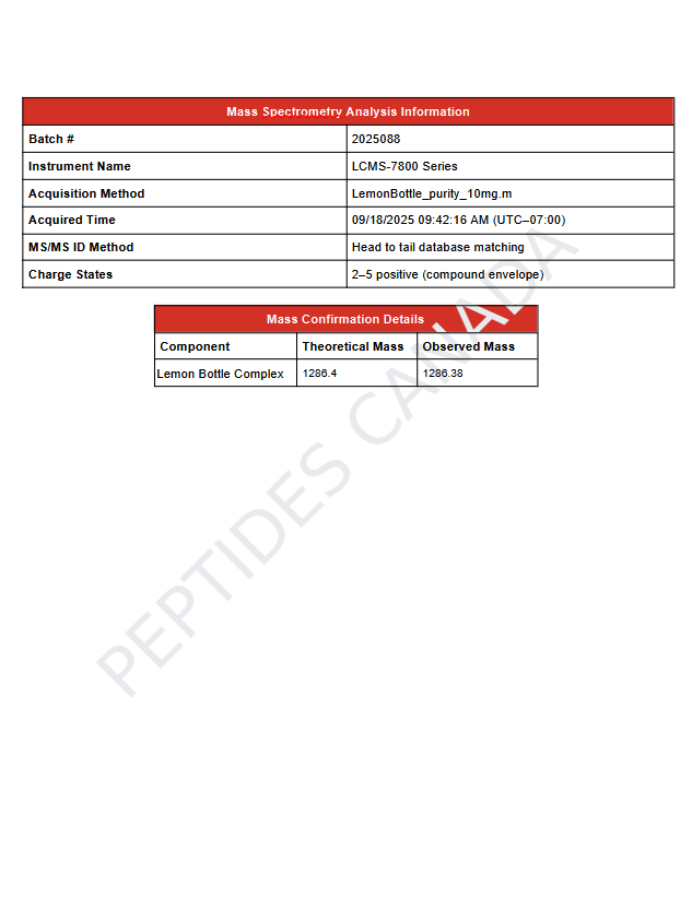 Lemon Bottle is a multi-component lipolysis research solution, and due to its formulation complexity, a single definitive molecular formula is not listed. Analytical identity and purity for this batch are verified by direct mass spectrometry and HPLC analysis.