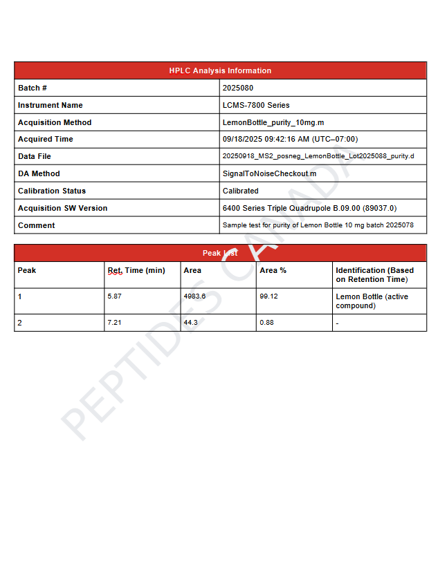 This batch of Lemon Bottle Peptide has been third party lab tested and verified for quality. Size: 10mg
