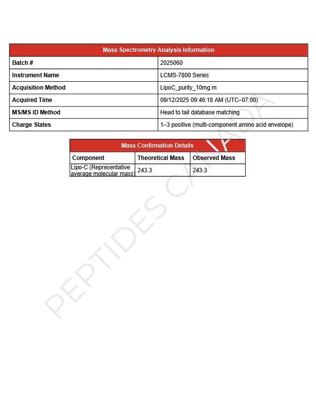 Lipo-C is derived from l-carnitine esterified with a lipophilic moiety, designed to enhance cellular uptake and mitochondrial delivery. Because structural derivation may vary, a single definitive molecular formula is not listed. Analytical identity and purity are confirmed for this batch.