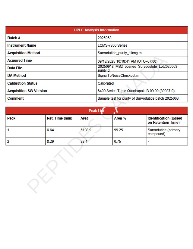 This batch of Survodutide Peptide has been third party lab tested and verified for quality. Size: 10mg