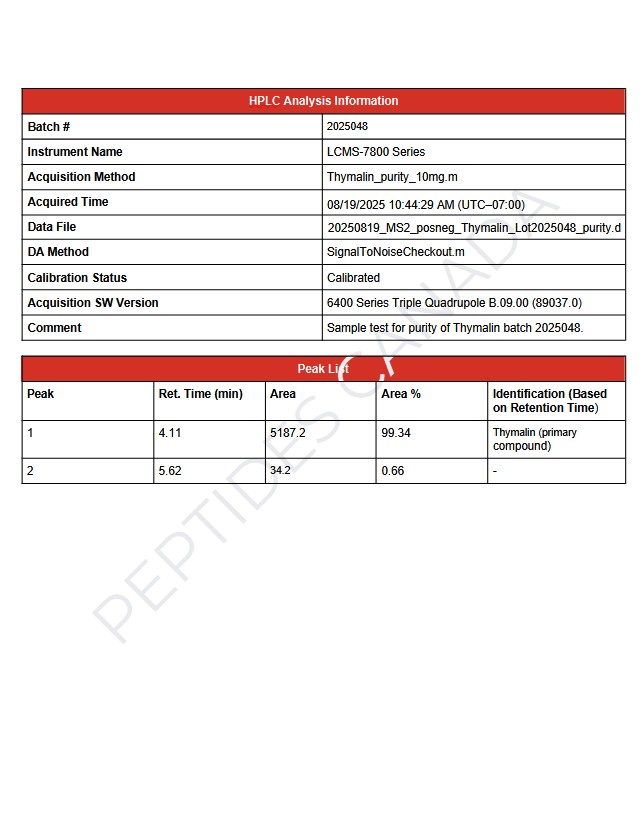 - Analysis Method: Reverse-phase HPLC (UV 214 nm) and LCMS (ESI+ mode), calibrated with thymic peptide reference standard.