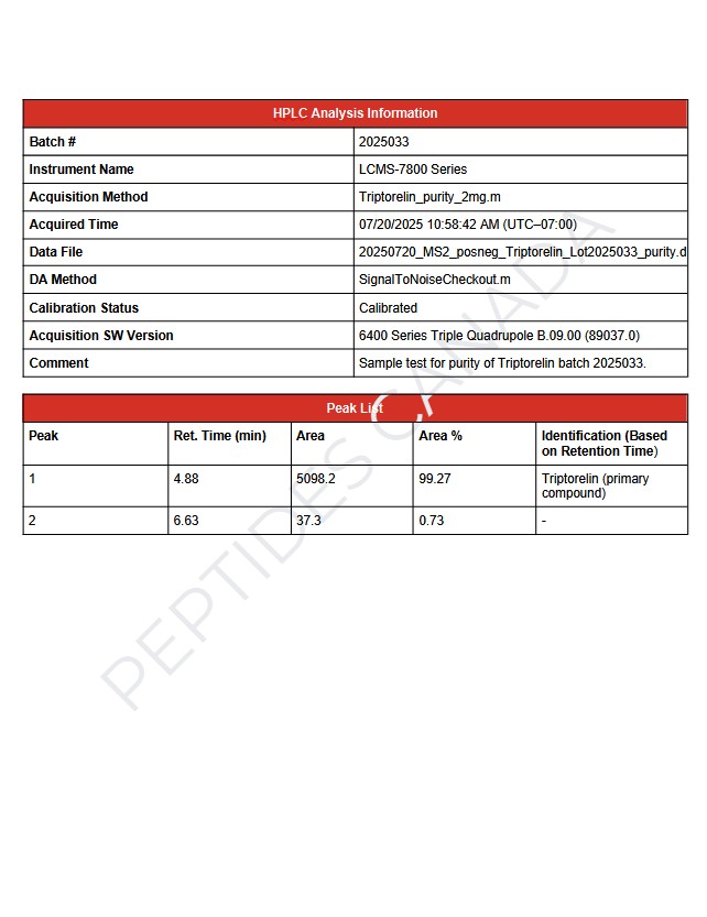 This batch of Triptorelin Peptide has been third party lab tested and verified for quality.